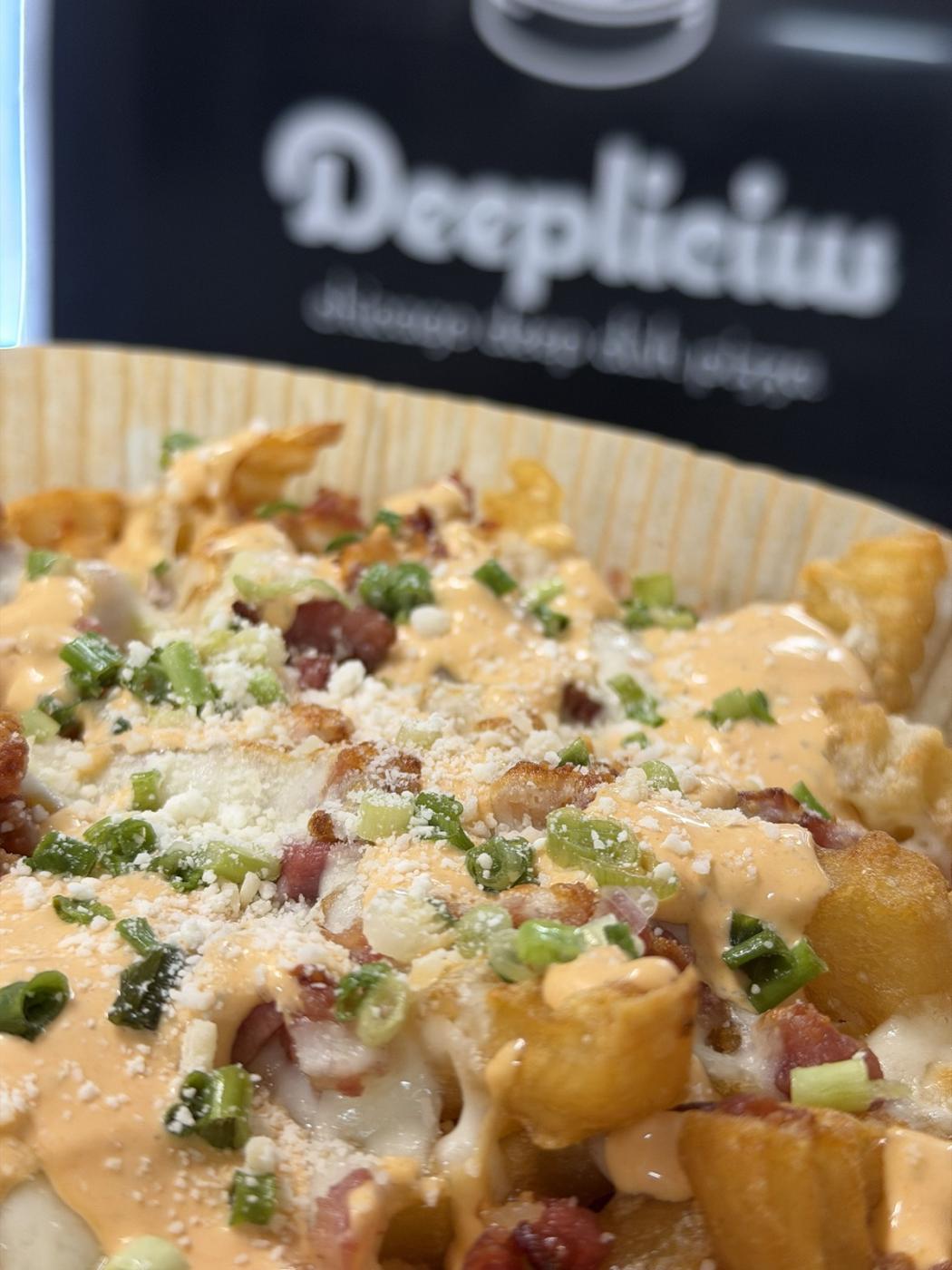 French fries topped with melted cheese and bacon bits.